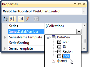 12、将WebChartControl.SeriesDataMember属性设置为Year,从而指定为系列名称提供数据的数据字段。