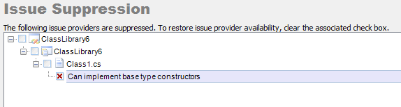 省略的部分显示在CodeRush的Editor | Code Analysis | Issue Suppression页面,你可以在这个页面删除问题。