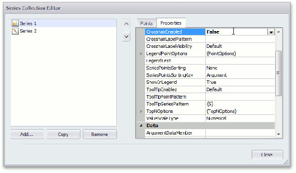 本文中,我们来禁用Bar系列的十字标签。通过图表的智能标签,调用Series Collection Editor。然后,在Series1的Properties 标签中找到SeriesBase.CrosshairEnabled属性,并将其设置为false。