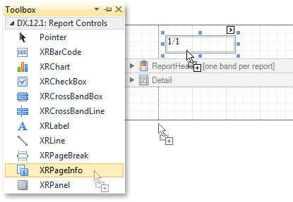 5、打开VS工具箱 (CTRL+ALT+X),将XRLabel从DX.12.1: Report Controls选项卡中拖动到报表表头,从而实现为报表添加一个控件。